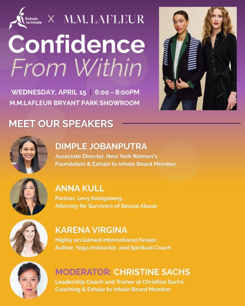 Join Exhale to Inhale for a special evening — beginning with a fireside conversation exploring how healing, advocacy, and community investment help women reclaim confidence and agency in their lives and leadership. In recognition of Sexual Assault Awareness Month, this discussion will highlight the importance of supporting survivors while building cultures where women can thrive. The fireside chat will be moderated by Christine Sachs, Leadership Coach and Trainer at Christine Sachs Coaching and Exhale to Inhale Board Member, and panelists include: