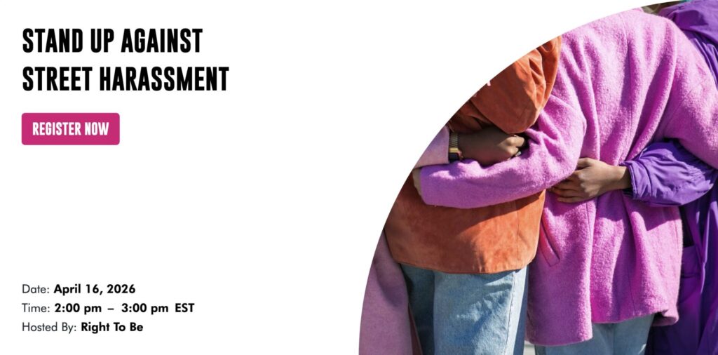 Right To Be has partnered with L’Oreal Paris to offer this free, one-hour, interactive training on how to safely intervene when you witness street harassment or when you experience it yourself. During this training, participants will learn a clear, adaptable, and expert-approved set of tools that have been proven to reduce the prevalence of street harassment, the Right To Be’s 5Ds of bystander intervention.