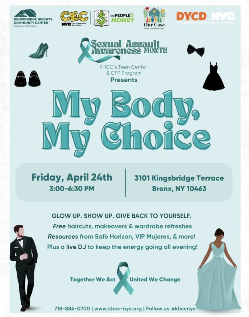Join Kingsbridge Heights Community Center for free haircuts, makeovers & wardrobe refreshes as we distribute prom dresses and provide wellness services to the community. Other resources from Safe Horizon, VIP Mujeres, & more will be available, plus a live DJ to keep the energy going all evening! KHCC prom drive donations close on Thursday, April 23rd.