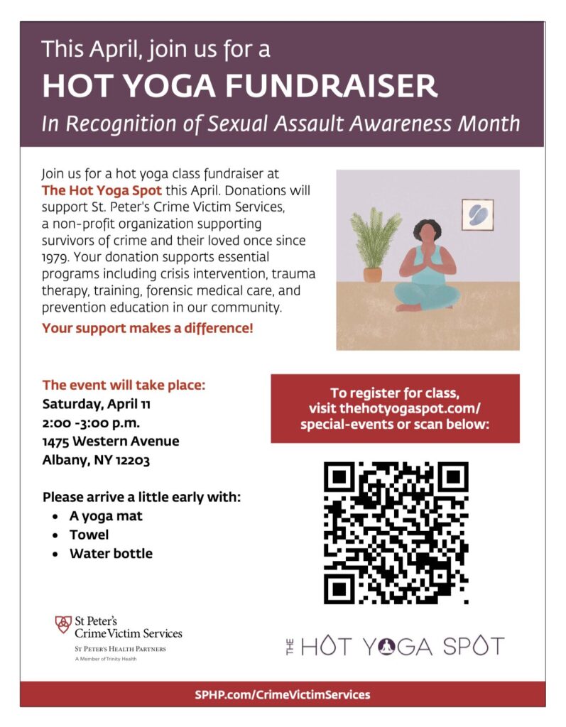 Join St. Peter’s Crime Victim Services for a hot yoga class fundraiser at The Hot Yoga Spot this April. Donations will support this non-profit organization that has supported survivors of crime and their loved once since 1979. A donation supports essential programs including crisis intervention, trauma therapy, training, forensic medical care, and prevention education in our community.
