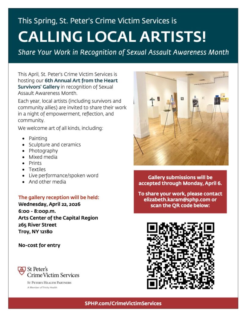 This April, St. Peter’s Crime Victim Services is hosting their 6th Annual Art from the Heart Survivors’ Gallery in recognition of Sexual Assault Awareness Month. Each year, local artists (including survivors and community allies) are invited to share their work in a night of empowerment, reflection, and community. We welcome art of all kinds of art and information to submit your work is available on the flier above. This event is free to attend and open to all community members.