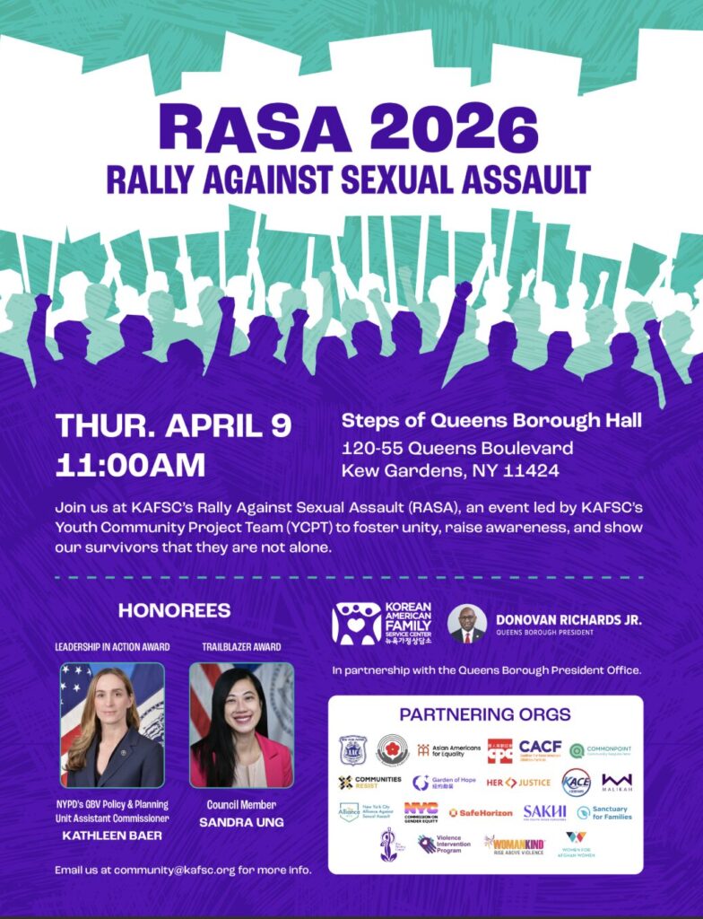 Korean American Family Service Center (KAFSC) invites community members, advocates, and allies to join us for RASA 2026: Rally Against Sexual Assault, a powerful gathering dedicated to raising awareness, standing in solidarity with survivors, and calling for a violence-free future.